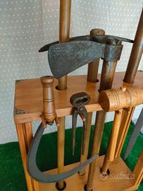 Attrezzi vintage da lavoro disposti in un manufatto in legno artigianale.