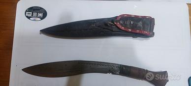 kukri originale, antico attrezzo da lavoro nepalese. in metallo con manico in legno e custodia in pelle dotata di particolare astuccio aggiuntivo.