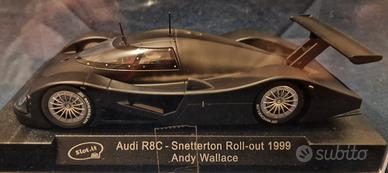 Ormai introvabile AUDI R8C in livrea nera opaca "test" pilotata da Andy Wallace a Snetterton nel 1999. Modello scala 1/32 prodotto da Slotit . in vetrinetta . Nuovo completo di pneus scorta. Mai entrata in pista. Impeccabile nella sua vetrinetta.