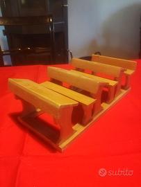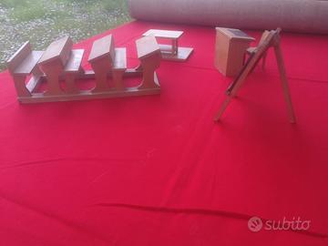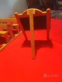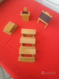 Aula di scuola del Ventennio, in legno, in miniatura, comprensiva di banchi in blocco unico, cattedra, pedana , lavagna, tavolino, sedia, anni '30.