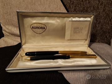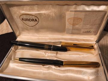 Set Aurora 88 Vintage - Stilografica Oro 14kt + Penna - Completo di Garanzia. Icona del design italiano anni '50 progettata da Marcello Nizzoli. - Penna Stilografica funzionante corpo nero con cappuccio laminato oro. Monta il pregiato pennino carenato in ORO MASSICCIO 14kt (gradazione M - Medio). Penna a sfera: Coordinata con cappuccio laminato oro.(Purtroppo rotta) Corredo Originale: Custodia Aurora dell'epoca in buone condizioni e Certificato di Garanzia originale.