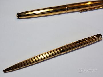 Set scrittura di lusso vintage Aurora 98, composto da penna stilografica Riserva Magica, caricamento a pistone e pennino oro 14k 585, e penna a sfera. Laminate in oro. Eccellenti condizioni.