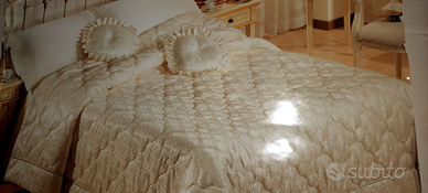 Vintage ma nuovo, set per il letto matrimoniale, trapuntino e due cuscini rotondi, pregiatissimo raso di colore oro.