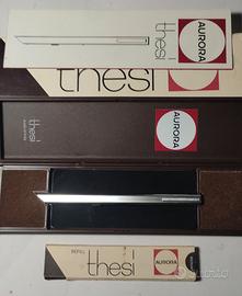 Aurora lotto di cinque cofanetti di cui 4 con una penna ed 1 con due penne. Ricevute in regalo per la mia Prima Comunione nel luglio del 1979. Mai utilizzate, le vendo perché non sono amante/conoscitore di tali oggetti. Da segnalare alcune scritte sullo scatolino esterno della penna Thesi, fatte evidentemente all'epoca per testare la penna. Per il resto sembrano esteticamente nuove. Non garantisco l'inchiostro all'interno delle penne che potrebbe essersi indurito per il tempo passato e potrebbero esserci altri segni del tempo che sfuggono alla mia visuale, pertanto le vendo senza garanzie, senza restituzione, visto e piaciuto.