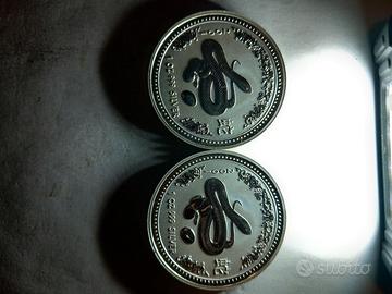 NUMERO 2 MONETE AUSTRALIA ANNO DEL SERPENTE DA I DOLLARO IN ARGENTO OGNI MONETA UN ONCIA IN ARGENTO 999/1000