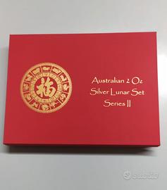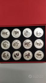 SET COMPLETO di dodici monete in argento puro (0,999) raffiguranti i 12 segni Zodiacali Cinesi emesse tra l’anno 2008 e il 2019, compongono la BRILLANTE e RARA Serie “Lunar II” emessa in pochissimi esemplari, in cofanetto originale della Royal Australian Mint.