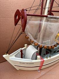 In vendita un bellissimo modellino di barca da pesca “Mary Jeanne” realizzato in legno, perfetto per collezionisti e amanti dello stile nautico. La riproduzione presenta dettagli curati, tra cui una rete da pesca sospesa, una cabina gialla e accessori come il salvagente. L’oggetto è ideale per decorare ambienti marittimi o come pezzo da esposizione. Condizioni ottime, una splendida aggiunta alla tua collezione o per donare un tocco marinaro alla tua casa.