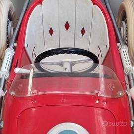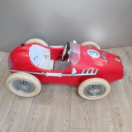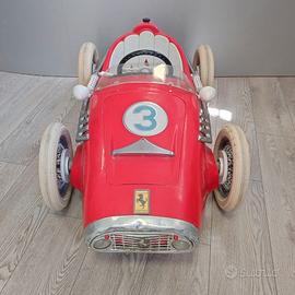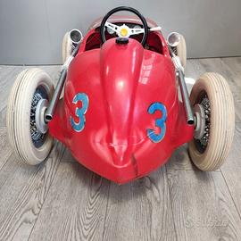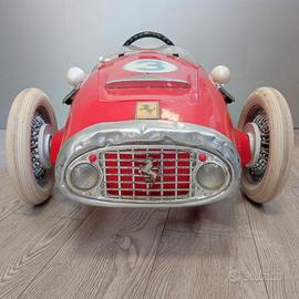 Auto a pedali marca BIEMME modello Ferrari 3000 probabile versione Extra Lusso realizzata in Moplen, calandra anteriore in metallo, tubi di scarico, specchietti, vetro para brezza (danneggiato nei punti di fissaggio). Cofano apribile con dettaglio motore, libretto e portachiavi. Meccanica in ordine, auto completa, anche del sedile. Segnalo la mascherina frontale danneggiata per i numerosi colpi e il retro con frattura ma complessivamente macchina in buona conservazione