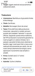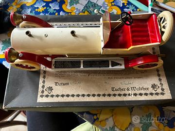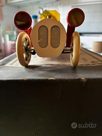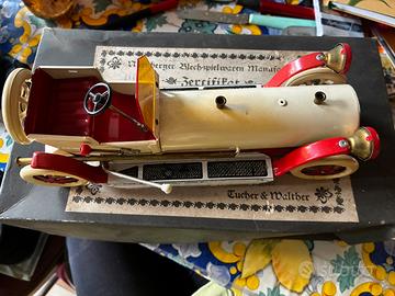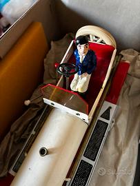 Auto con carica meccanica funzionante e in perfette condizioni. Omino in resina con testa incollata. Completa di scatola in ottime condizioni, colore rosso e panna. Misure scatola 30x17x11,5