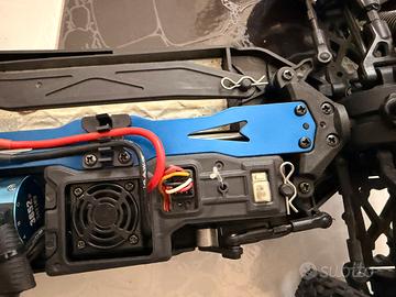 Il modello è perfettamente funzionante ed è molto molto veloce. Si possono fare un sacco di regolazioni sia meccaniche (ammortizzatori, campanatura e convergenza), sia elettroniche tramite le rontelle presenti sul radiocomando.
