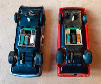 Pista elettrica anni '70 perfettamente funzionante, completa di tutti gli accessori originali, qualche segno di usura del tempo (vetro scheggiato automobilina grigia ed un paio di supporti rossi danneggiati).
