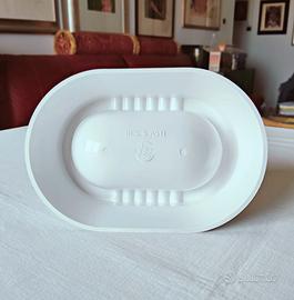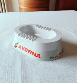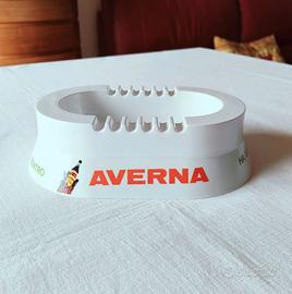 Posacenere pubblicitario vintage Averna, realizzato in plastica rigida bianca con forma ovale e bordi dotati di multiple scanalature per sigarette
