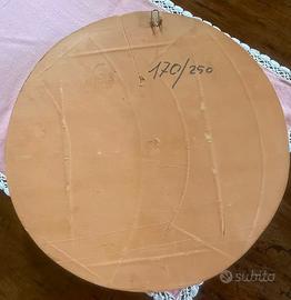 Donna che cuoce le tigelle. Terracotta scultore di Pavullo (mo) Azelio Babbini . Diametro cm 40. Numero 170/250.
