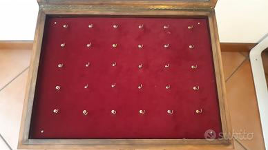 Porta medaglie artigianale con cornice in legno, ben rifinita e di ottima fattura. Sportello in vetro apribile con gancetto e fondo in velluto bordeaux . Può ospitare fino a 30 medaglie.