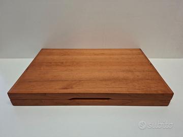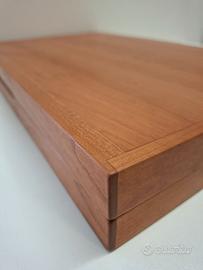 Backgammon a valigetta dimensioni chiuso cm 50 x 32 x 6. Prodotto artigianale in ciliegio massello finitura a cera, piano di gioco in sughero, pedine diametro cm 4 e punte laccate, colori rosso e avorio chiaro. Cerniere invisibili, chiusura magnetica.