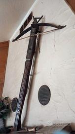 Magnifica balestra decorativa di grandi dimensioni. Il fusto in legno è finemente intagliato con motivi geometrici. Un pezzo di grande impatto visivo, perfetto per taverne, castelli o collezioni di armi antiche.