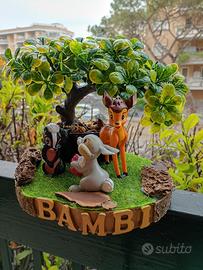 Deliziosa composizione fatta a mano. Base circolare in legno diametro cm 17. Rivestita da erbetta sintetica e con sopra un piccolo bonsai,che funge da albero..Nella composizione sono presenti oltre Bambi anche i suoi amici Fiorellino e Tamburino, originali Disney.Scritta Bambi con lettere dipinte sempre a mano, in legno, sulla parte anteriore. Altezza cm 15 Solo spedizione📦📪 Bella idea regalo🎁 Pezzo unico ed originale✅