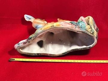Bellissimo soprammobile con vaso in ceramica anni 50, con rappresentazione in 3D di giovane cerbiatto, in imitazione del film della Disney, Bamby molto in voga in quel periodo. la ceramica policroma e di buona fattura e riporta al suo interno la scritta ITALY. Le misure generali sono cm.32x28x10. in buone condizioni come da foto.
