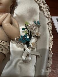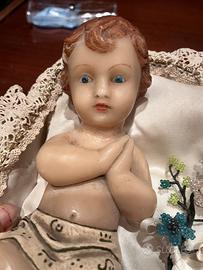 In ottime condizioni, di fattura artigianale, posizionato su una raffinata culletta interamente rivestita in raso e dotata di cuscinetto, circondata da un merletto antico e con accanto una decorazione realizzata da fiorellini in perline e in cera. Il bambinello non è antico, ma sicuramente ha una trentina d'anni.