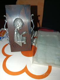 Bambino I comunione in peltro su base in legno con supporto sul retro. Altezza cm 10 larghezza cm 6. Anni settanta, co scatola originale