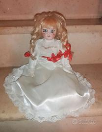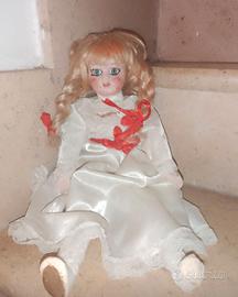 Bambola artigianale porcellana dipinta facsimile ad Annabelle vestito di raso avorio nastrini rossi ........