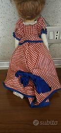 Bambola anni '50 da collezione. Con viso e braccia di velluto. Abito di taffetà. Completa di sottoveste, mutandoni, calze e cappellino. Jabot e colletto di pizzo. Altezza cm 30. Necessita solo di una pulita agli abiti.