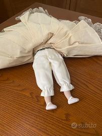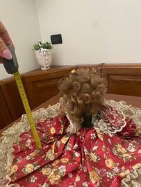 bambola anni 90 in stoffa e viso, mani e piedi in ceramica. Ottimo stato, misure presenti in foto. Vendo ad euro 45.00. Se interessati lasciate un recapito e vi richiamo io. Grazie