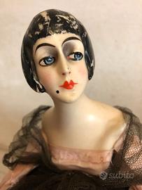Raffinata bambola in cera e porcellana primi '900, in piedi, con abito lungo impreziosito da merletti neri, oggetto particolare. Altezza circa cm 25.