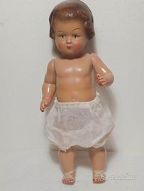 Antica bambola in composito testa non snodabile, braccia e gambe snodabili, n° 3 indumenti (mutandine, sottoveste, abito) in organza bianca con decorazioni in pizzo, finto smalto rosso sulle unghie delle mani e dei piedi . In buone condizioni come lievi segni del tempo come da foto che sono parte integrante della descrizione dell'oggetto. Dimensioni: altezza cm 25.