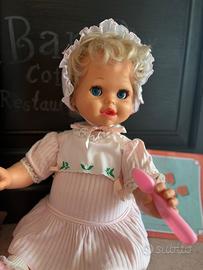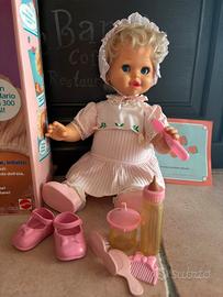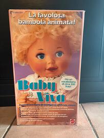 Vendo bambola Baby Viva prodotta dalla Mattel negli anni ‘80. La bambola perfettamente funzionante è animata, muove la testa, gli occhi e la bocca, e riproduce circa 300 frasi È progettata per simulare la crescita da 6 mesi a 2 anni, rispondendo diversamente a seconda dell'età impostata. E’ corredata di abbigliamento, accessori originali e scatola in discrete condizioni