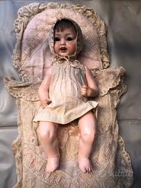 Antica bambola "happy character baby" in bisquit , produzione tedesca " hertel schwab " 152/4 , produzione inizio '900, ottime condizioni (gli occhi sono all'interno della testa - guardare foto ) ,gambe braccia testa snodati ,dimensioni bambola altezza 35cm , cuscino porta bambola 70 cm x 35 cm , raro da trovare in questo stato da collezione , guardare foto .bambola molto bella da intenditori di giocattoli d'epoca.