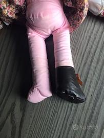 Bella bambola con capelli folti e lucenti. Il viso presenta delle macchioline come da foto. Il corpo ha colori brillanti ma è presente una piccola scucitura e alcuni ingiallimenti. Mancano una scarpa e i mutandoni. Alta 38 cm