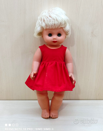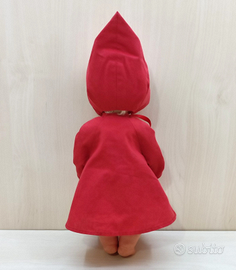 Bambola Cappuccetto Rosso vintage degli anni 80 con corpo in vinile da collezione, arti mobili e occhi cliccanti, altezza 36 cm. L'abbigliamento è composto da un vestito, un cappotto ed il cappuccio.