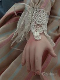 Bambola d'Artista finemente lavorata in Porcellana Biscuit in LIMITED EDITION, alta 74 cm circa, è una sitting doll (bambola seduta) MAI stata esposta. Ha occhi in pregiatissimo vetro (Lauscha), capelli lunghi e folti pettinati in morbidi boccoli biondi, abito in raso adornato di nastri e trini e sottogonna in shantung di seta. Indossa un cappellino fatto all'uncinetto di color ecrù ricchissimo di dettagli. La bambola è stata ideata scalza e indossa gli abiti dell'Epoca a cui è ispirata. Completa di fiore (non visibile in foto) e di COA (Certificato di Autenticità) Numerato e Firmato dall'Artista.