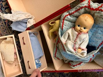 Bambola baby d’epoca con valigia armadio con accessori e vestiti. Anni ‘50.