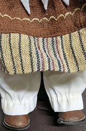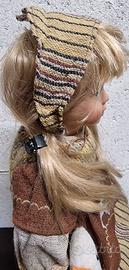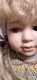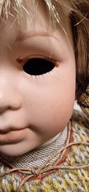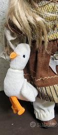 Bambola decorativa in stile rustico/country, completa di abiti originali ricamati, cuffia coordinata e piccola oca di peluche. Dettagli: Viso in materiale ceramico/porcellana, capelli biondi con acconciatura a trecce. Stato: La bambola presenta alcuni segni del tempo e necessita di restauro (manca l'occhio sinistro e presenta un piccolo cerotto decorativo sulla mano). Ideale per collezionisti o amanti del restauro vintage. Accessori inclusi: Abito completo e peluche oca.