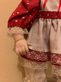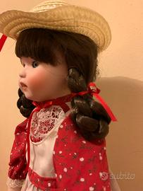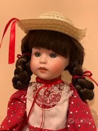 Bambola di porcellana da collezione Heritage Mint Ltd. con abito a pois rossi e grembiule bianco. - Cappello di paglia con nastro rosso. - Dettagli in pizzo sull'abito e sui pantaloni. - Include cartellino originale 'The Heritage Mint Ltd. Collection'.