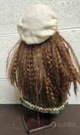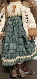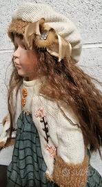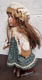 Splendida bambola da collezione in pregiata porcellana, curata nei minimi dettagli. Dettagli: Viso dipinto a mano con espressione dolce, occhi azzurri e lunghi capelli castani mossi. Abbigliamento: Outfit invernale completo composto da cappottino ricamato con bordi in pelliccia sintetica, gonna scozzese verde, berretto in lana coordinato e stivaletti stringati. Condizioni: Ottime, come da foto. Inclusa di supporto espositivo in legno/metallo per tenerla in piedi.
