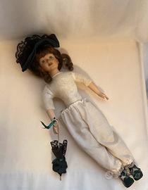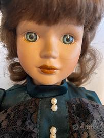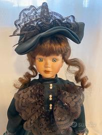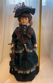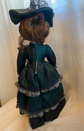 Bambola da collezione alta 45 cm, in porcellana e corpo morbido. Viso mani e piedi in fine porcellana biscuit. Questa fama indossa un abito in stile Belle Époque o vittoriano in raso verde scuro e nero, decorato con pizzo e balze. L'acconciatura originale con riccioli, cappellino, ombrellino e scarpine coordinati. La bambola è dotata di supporto espositivo costituito da asta metallica regolabile e base.