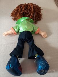 Simpatica bambola di pezza in morbido tessuto, perfetta per amanti dello stile vintage anni 2000 o collezionisti di bambole "rag doll" moderne. Indossa un outfit iconico composto da camicetta verde fluo lucida annodata in vita, top fucsia, pantaloni a zampa con strappi e grandi scarpe da ginnastica metallizzate blu e rosse. Capelli ricci marroni in lana, occhi azzurri ricamati e una collanina con perlina azzurra. Altezza circa 40 cm (come visibile in foto con il metro). Ottime condizioni vintage, ben conservata. Non presenta etichette di marca visibili. #y2k #y2kstyle #y2kaesthetic #anni2000 #2000s #nostalgia #vintage2000 #popstarstyle #bratzstyle