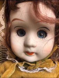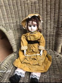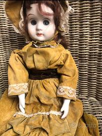 Bambola di porcellana vintage,vestito di velluto con evidenti segni del tempo,occhi in vetro/cristallo,un piede da riparare,bambola da collezione,altezza 45 cm
