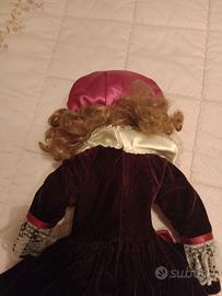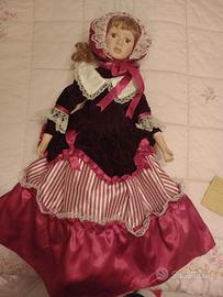 bambola di porcellana con bel vestito rosso. Anni 1980-90. ha corpo in stoffa, testa, braccia e piedi in porcellana. Le parti in porcellana sono integre e anche il vestito. Misure lunghezza cm. 68, larghezza cm. 25, testa cm 10.30 X 7,30.