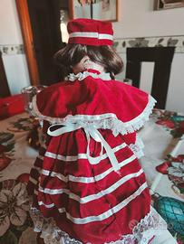 Vestito di velluto rosso scuro, semirigido con cappellino e cappa che si possono togliere, scarpette bianche, capelli castani a trecce, occhi nocciola.