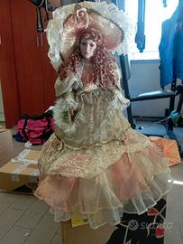 Vendo bambola di porcellana con piedistallo per farla stare in posizione eretta.Abito ricco di dettagli.Non spedisco.