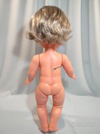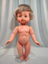 Bellissimo e grande bambolotto della GALLETTI GALBA CICOGNA anni 1960, alto cm. 50 circa, con logo Cicogna sulla schiena. Bambola con testa in vinile mentre busto ed arti in polietilene soffiato, capelli ben radicati, lavabili e pettinabili; occhi mobili azzurri.