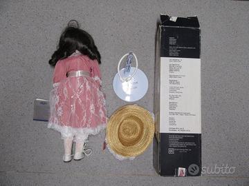 Bambola di porcellana dipinta a mano, alta 40 centimetri di nome Suzette D-34: fa parte della American’s Collection II, prodotta da Heritage Mint Ltd. Collections nel 1988. La confezione in cartone contiene la bambola, il foglio illustrativo e le notizie sul prodotto e supporto per esposizione.