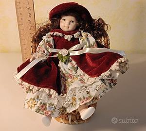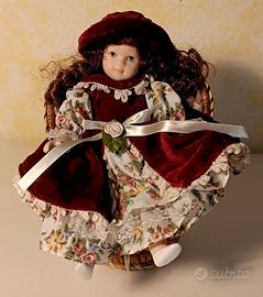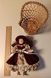 Bambola in ceramica con poltrona in vimini
