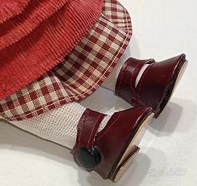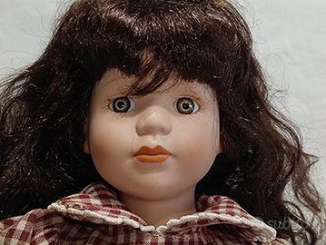 Bambola in ceramica con vestito rosso in ottime condizioni. Corpo di pezza, arti in materiale ceramico, capelli mossi castani, trucco originale, occhiscuri non graffiati. Abito in cotone a quadretti, polyestere e velluto. Altezza da seduta circa 25 cm. Le foto sono parte integrante della descrizione.