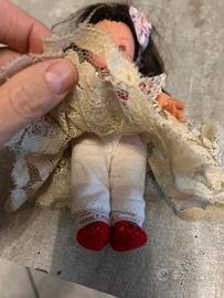 Bambolina in plastica vestita interamente a mano, dalla fascia in testa alle babbucce realizzate a uncinetto. Unici segni di usura sono visibili sugli occhi.