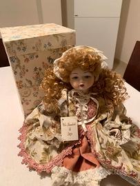 Bambola in porcellana Biscuit interamente fatta a mano Vestito in broccato rifinito con passamaneria Scatola originale Altezza 35 cm